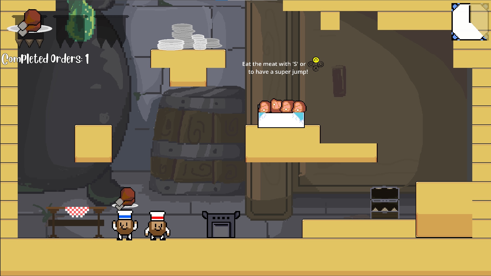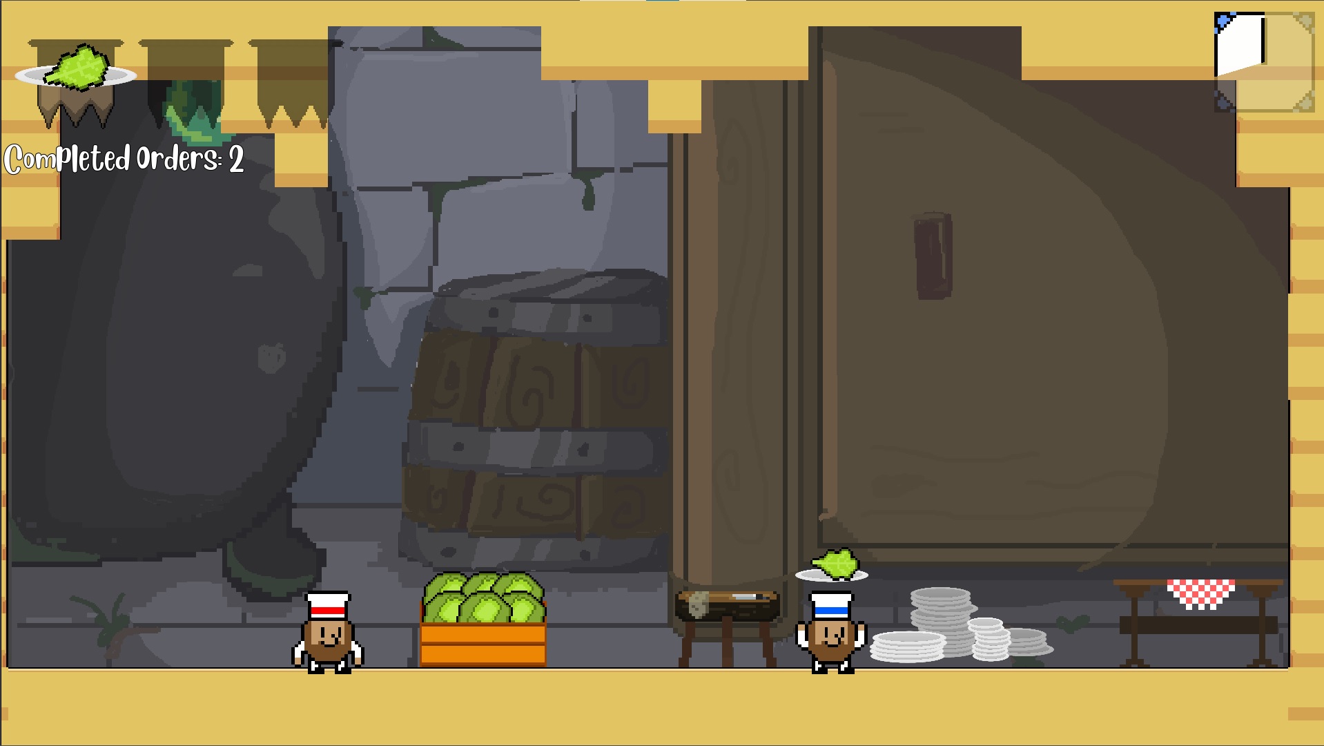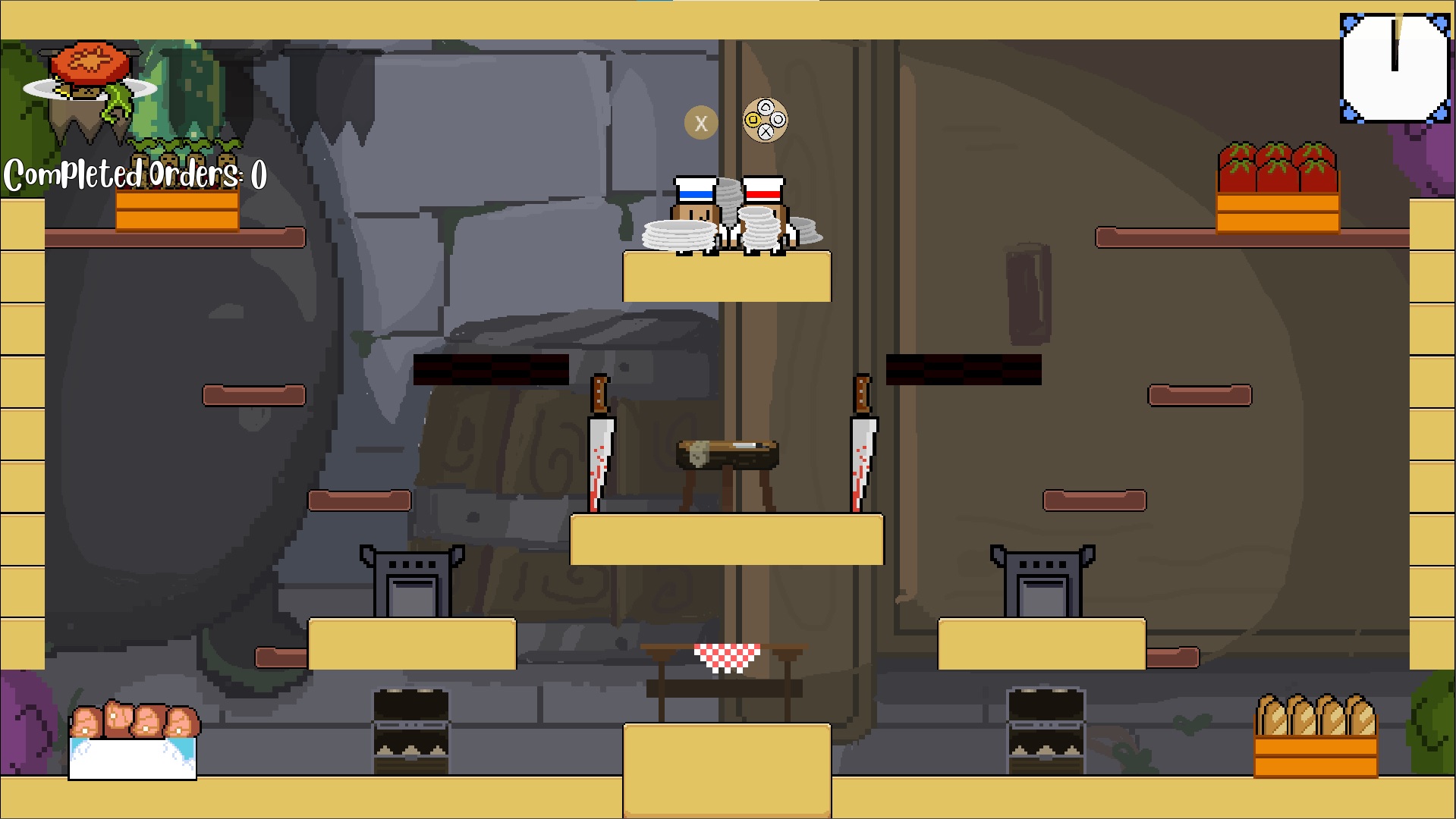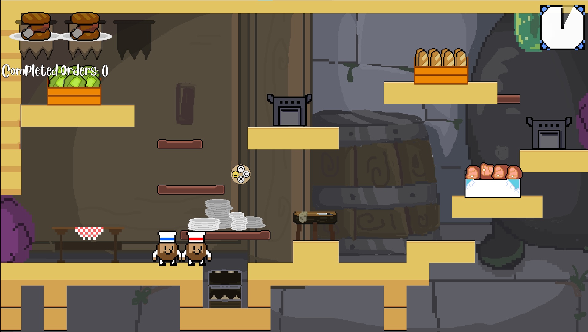 Tenes que entregar las ordenes que te piden, llevando los ingredientes a la plataforma con la banderita.